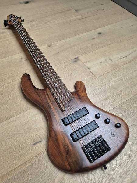 Der Body ist aus Nußbaum (die legendären Gewehrkolbenrohlinge) und sehr leicht. Der Hals hat ein sehr schlankes Profil und auch die Saitenabstände sind eher eng. Ausgestattet mit Rough-Crystal-Tonabnehmer und einer einfachen passiven Elektronik kann man hier nichts falsch machen.