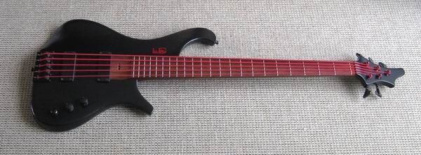 Ende 2007 hatte ich meinen ersten LeFay Herr Schwarz Fünfsaiter verkauft und danach ausschließlich den Herr Schwarz Sechssaiter gespielt. Mit der Zeit vermißte ich dennoch einige spezifische Eigenschaften des Padouk/Palisander-Halses. Da kam es mir gerade recht, dass ein guter Bekannter seinen Fünfsaiter mit genau dieser Holzkombination verkaufen wollte. So kam es, dass ich Mitte 2009 meinen Fuhrpark um diese schöne Exemplar erweiterte. Anmerkung: Die coolen roten Saiten sind DR Extra Life Red Devils. |