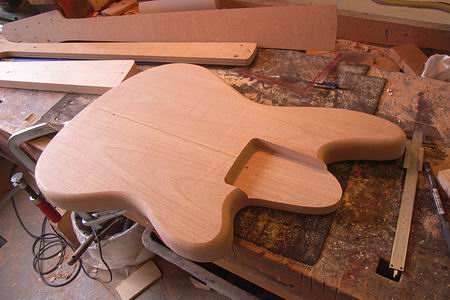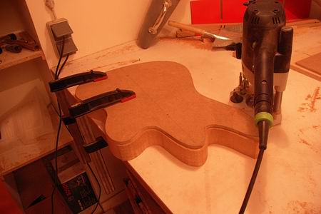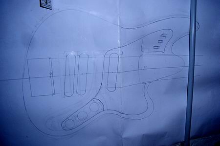 Am Anfang der Umsetzungsphase stand zunächst ein Entwurf auf Papier. Die klassische Vorlage mußte sowohl an die Anforderungen eines Sechssaiters (Kopflastigkeit vermeiden) angepasst werden, als auch signifiziert werden. Der Body wurde geschert, das obere Horn gestreckt und die untere Korpushälfte zurückgezogen. Die Linienführung der schräggestellten Pickus und des Pickguards wurden harmonisiert. Als relativ mühsam (man erkennt die vielen ausradierten Zwischenentwürfe) stellte es sich heraus, eine ansprechende Form für das Potiblech zu finden. Die drei Schiebeschalter auf dem oberen Blech wirken bereits auf dem Papier attraktiv.Der komplett neu entworfene Bass erforderte neue Schablonen für Hals und Korpus. Hier wird der Body aus dem Rohling gesägt.