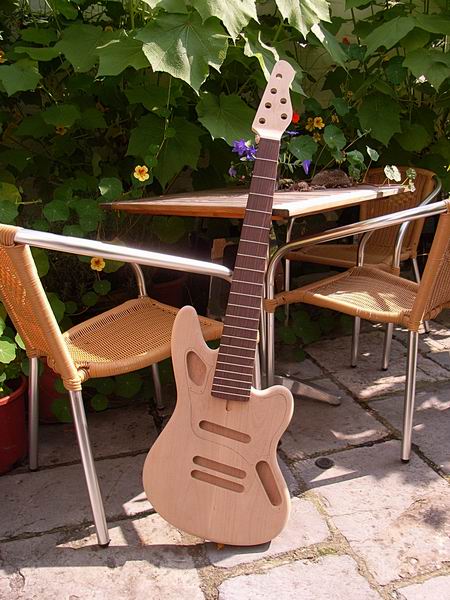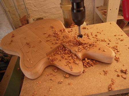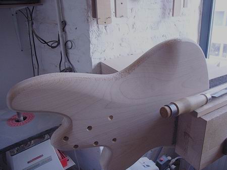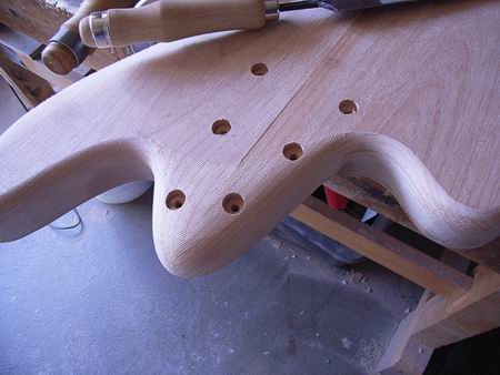 Der fertige, unlackierte Body. Die Kanäle für die Verkabelung werden nach der Montage vom Pickguard verdeckt sein.