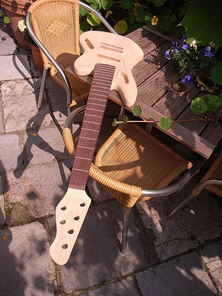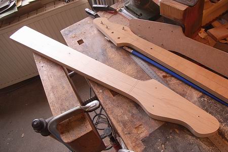 Der Halsrohling. Die Kopfplatte wird klassisch versetzt und aus einem Stück sein, nicht angewinkelt und geleimt.