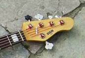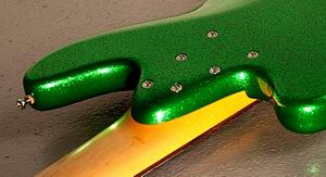 Verschaltung Die Tonabnehmer will ich in beliebiger Weise miteinander parallel kombinieren können (1, 2, 3, 1+2, 1+3, 2+3, 1+2+3). Und zudem möchte ich das Instrument vollständig stummschalten können. Eine serielle Verschaltung der Tonabnehmer brauche ich nicht, mit dieser Klangvariante konnte ich bislang nie warm werden. Weiterhin möchte ich kein Volumen- oder Tonepoti haben. Das macht live nur Ärger, wenn man mal aus Versehen drankommt. Als Bassist fummelt man ja nicht ständig an Soundfeinheiten herum. Es reicht mir, mit Tonabnehmerkombinationen drastische Soundunterschiede zu realisieren und feinere Anpassungen dann bei Bedarf am Verstärker zu machen. Die Lösung war dann, alle Tonabnehmer parallel zu verschalten und jeweils mit einem eigenen An/Ausschalter zu versehen. Hiermit sind all meine Anforderungen abgedeckt. Da es sein kann, dass mir in zwei Jahren doch nach einer Aktivelektronik gelüstet, haben wir bereits jetzt ein Elektronikfach und drei Potis vorgesehen. Die sind dann im Moment funktionslos. Im LeFay Herr Schwarz benutze ich seit einiger Zeit einen Stellartone Tonestyler. Ein tolles Teil, das zusammen mit den breitbandigen Rough-Crystal-Tonabnehmern viele schöne mittige Sound erlaubt. So einen haben wir dann auch eingeplant.Halsverbindung Die Schraubhalskonstruktion war ausgemachte Sache. Sign Guitars verwendet hierfür eine gegenüber dem amerikanischen Vorbild stabilere 6-Punkt-Befestigung. Ein Konstruktionsdetail, das sich über viele Jahre in unzähligen Instrumenten bestens bewährt hat. Nullbund und Bundanzahl Der Nullbund ist eines meiner persönlichen Lieblingsfeatures. Zum ersten mal lief er mir bei diesem Trace Elliot T-Bass über den Weg: