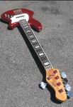 In mehreren Designsessions haben wir dann Stück für Stück das Konzept des Basses erarbeitet. Alles wurde fein säuberlich in einem Spezifikationsdokument festgehalten. Die Hölzer Vorlage war ein roter jottartiger Fünfsaiter, der von den üblichen Fachzeitschriften mit großer Begeisterung getestet wurde. Mich hatte dieses Instrument angesprochen wegen seines stabilen Tones und des sehr charaktervoll knurrenden Soundes.