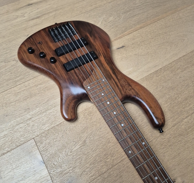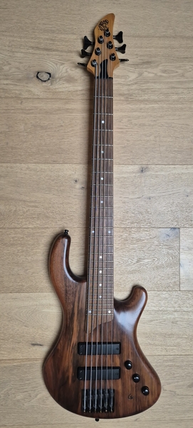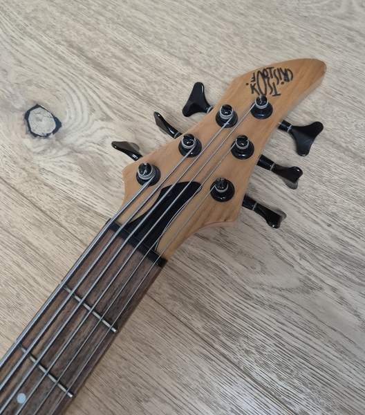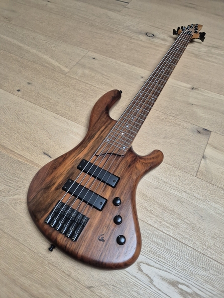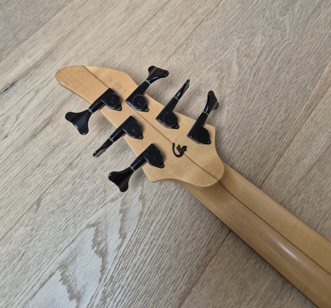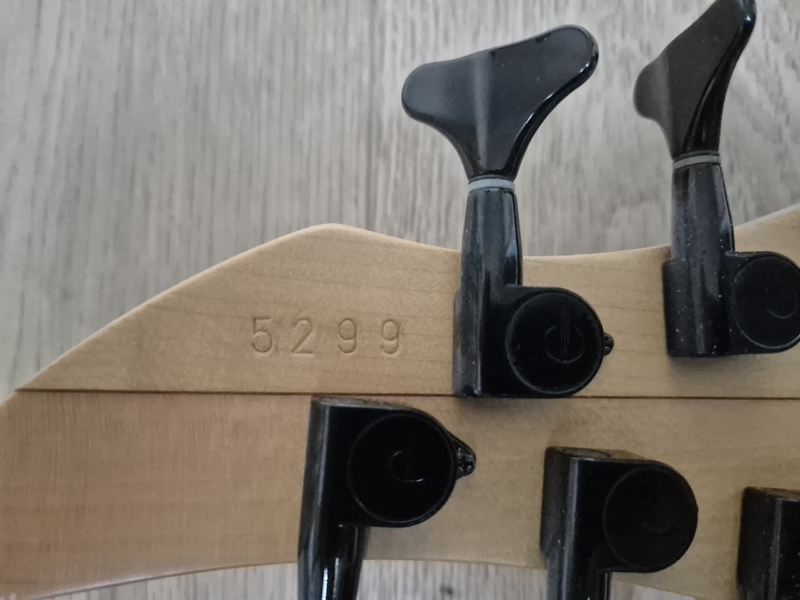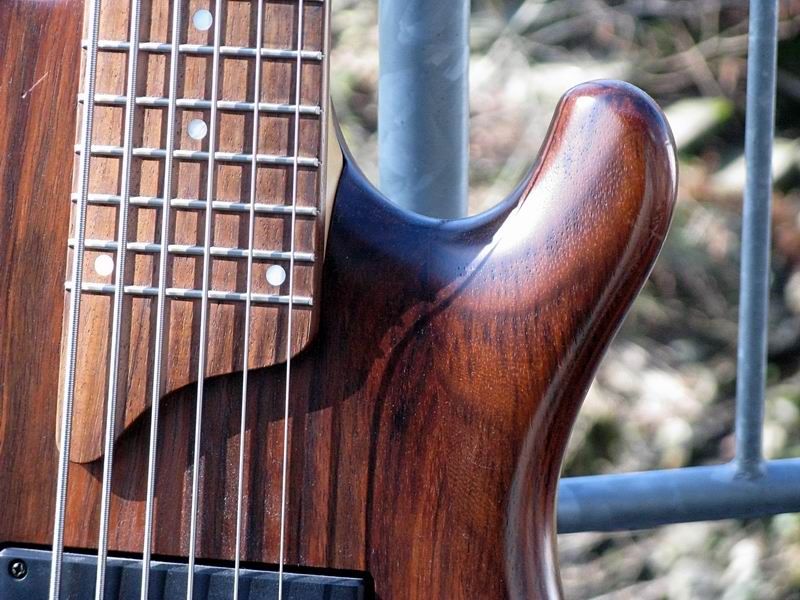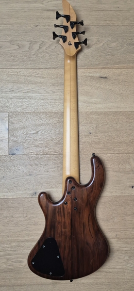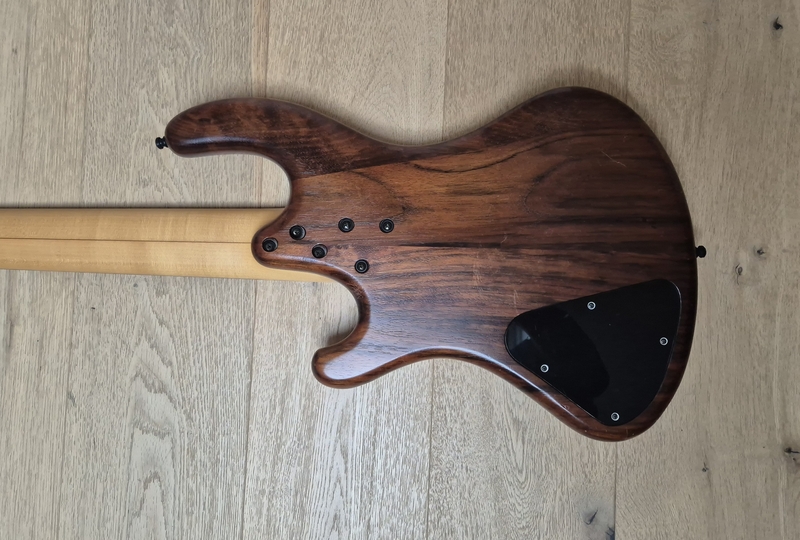 Der Body ist aus Nußbaum (die legendären Gewehrkolbenrohlinge) und sehr leicht. Der Hals hat ein sehr schlankes Profil und auch die Saitenabstände sind eher eng. Ausgestattet mit Rough-Crystal-Tonabnehmer und einer einfachen passiven Elektronik kann man hier nichts falsch machen.